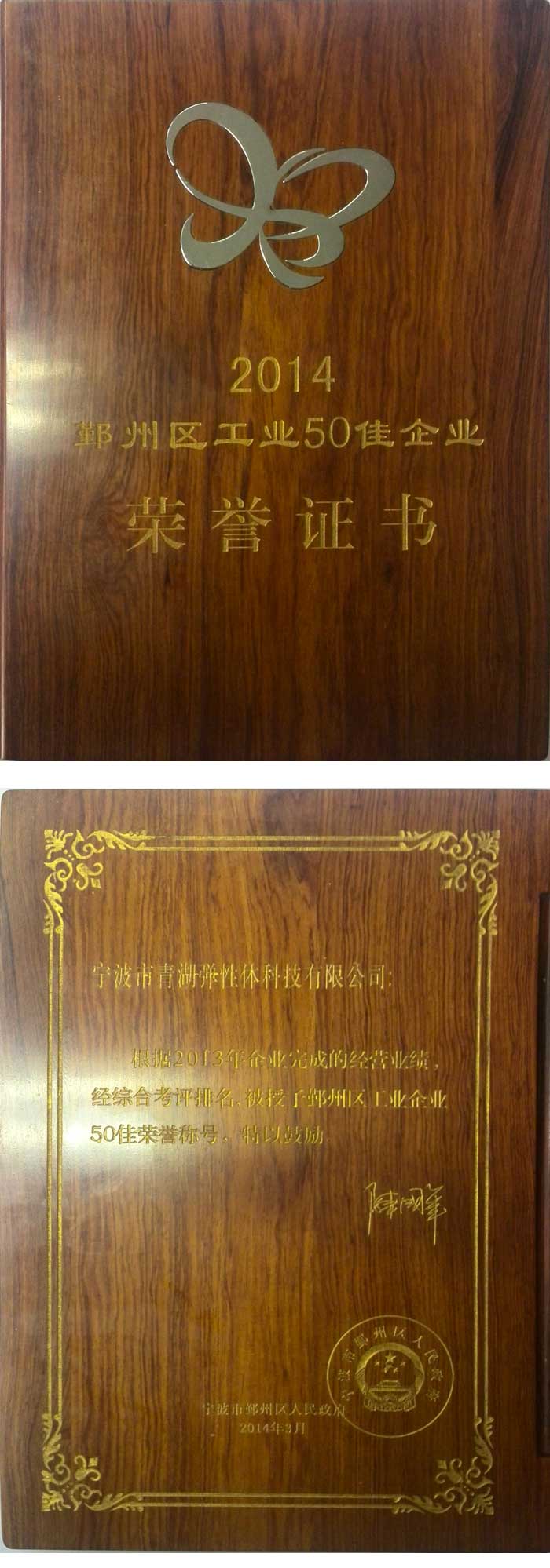 2014年6月18日,寧波市青湖彈性體科技有限公司獲得鄞州區(qū)人民政府頒發(fā)授予的“2014鄞州區(qū)工業(yè)50佳企業(yè)”榮譽證書。